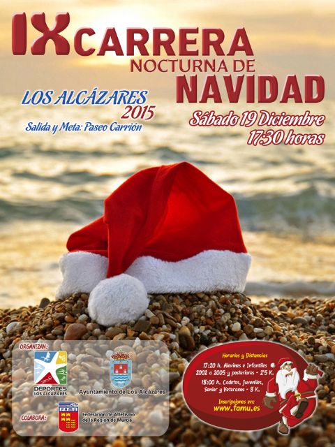 Por noveno año, Los Alcázares conmemorará las fiestas navideñas de la mejor forma. La Concejalía de Deportes del municipio, en colaboración con la Federación de Atletismo de la Región de Murcia, organiza la IX Carrera Nocturna de Navidad a celebrar el próximo sábado 19 de diciembre a partir de las 17:20h. con las carreras de menores, teniendo lugar a las 18:00h. la cita absoluta sobre una distancia de 8km. El recorrido discurrirá íntegramente por el paseo de la playa de Los Alcázares, con salida y meta en el Paseo Carrión.