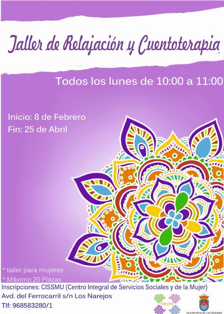 La Concejalía de Política Social organiza una nueva acción formativa que favorecerá el bienestar de sus participantes. En esta ocasión, será un Taller de Relajación y Cuentoterapia" que dará comienzo el próximo 8 de febrero en el CISSMU (Centro Integral de Servicios Sociales y de la Mujer) en horario de mañanas de 10:00 a 11:00 horas con un total de 12 sesiones.