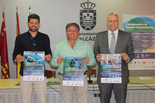 El alcalde de Los Alcázares, Anastasio Bastida, el director General de Deportes de la UCAM, Pablo Rosique y el concejal de Deportes, Nicolás Ruiz Gomez han presentado hoy los Campeonatos de España Universitarios de Taekwondo , Triatlón y Bádminton que se celebrará en Los Alcázares.