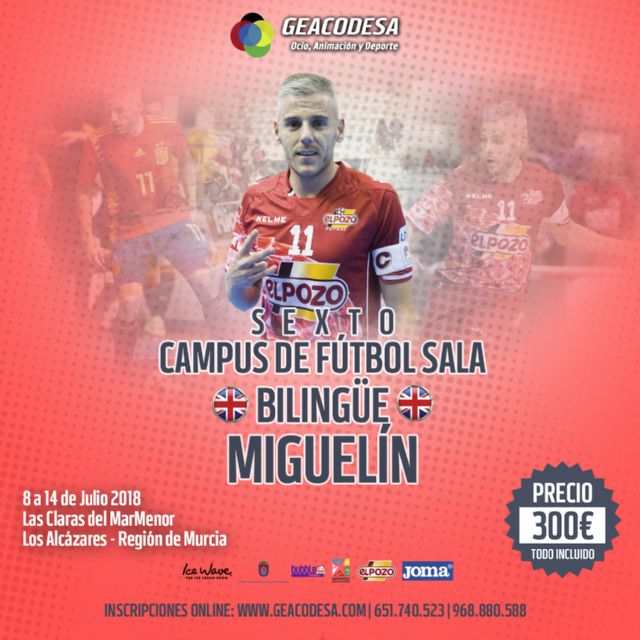 El capitán e internacional de ElPozo Murcia FS, Miguel Sayago Martí 'Miguelín, junto al gerente de Geocadesa gestión deportiva, Antonio Legido, presentaron la SEXTA edición del Campus de Fútbol Sala Bilingüe Miguelín y que se desarrollará en la localidad del Mar Menor de Los Alcázares del 8 al 14 de Julio. Dirigido a niños y niñas desde 6 años a jóvenes de 18 años.