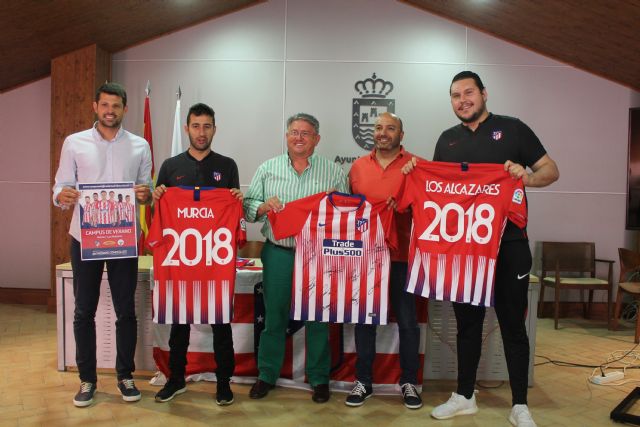 El alcalde de Los Alcázares, Anastasio Bastida, el responsable del Campus y Academia del Atlético Madrid, Jorge Peraza, el entrenador de Formación en Programas Internacionales, Luis Degano, el concejal de Deportes, Nicolás Ruiz y el responsable de Organización del Colegio Las Claras del Mar Menor, Raúl Ángel Ayala, han presentado esta mañana el I Campus del Atlético Madrid que se va a realizar en el municipio el próximo mes de julio.