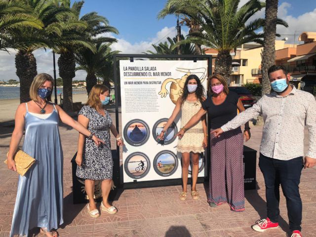 Esta mañana se ha presentado en el Paseo Marítimo de San Pedro del Pinatar la primera exposición interactiva urbana itinerante de la Región de Murcia: "La Pandilla Salada, descubriendo el Mar Menor". Una muestra que está equipada con audio guías y retos lúdicos pensados para todos los públicos. Esta acción está promovida y organizada por la Dirección General de Mar Menor, dependiente de la Consejería de Agua, Agricultura, Ganadería, Pesca y Medio Ambiente. Una iniciativa cuyo objetivo es poner en valor el importante patrimonio Natural de la Región de Murcia a través de la flora, fauna, entorno y ecosistemas del humedal más grande de Europa, el Mar Menor, como así lo ha refrendado en la presentación de la muestra la Directora General del Mar Menor, Miriam Pérez. Al acto también han acudido Visitación Martínez, Alcaldesa de San Pedro del Pinatar, y los concejales responsables de medio ambiente y turismo de las localidades participantes de esta novedosa iniciativa: Silvia Egea, (San Pedro del Pinatar), Antonio Martínez (San Javier), Antonio Luis López Campoy y María José Díaz Aragón (Los Alcázares), así como María Casajús (Cartagena).