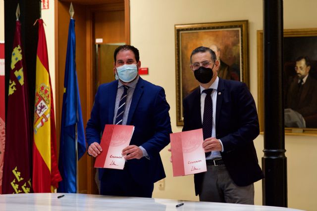 La Universidad de Murcia y el Ayuntamiento de Los Alcázares han firmado este miércoles el convenio por el que se pone en marcha la sede permanente de extensión universitaria de la institución en el municipio. Gracias a la sede permanente se desarrollarán actividades de promoción de la cultura y el deporte en la localidad. El rector de la UMU, José Luján, y Mario Ginés Pérez, alcalde de Los Alcázares, han sido los encargados de firmar el convenio.