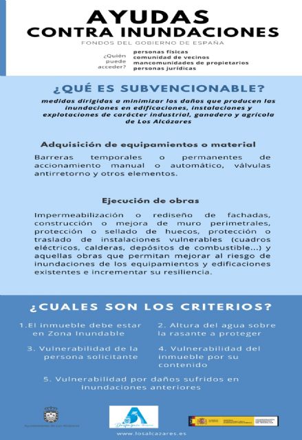 La finalidad de estas ayudas es adaptar al riesgo de inundación un conjunto de edificaciones, equipamientos urbanos y otro tipo de instalaciones o explotaciones de carácter industrial, agrícola o ganadero en el término municipal de Los Alcázares, de forma que se minimicen los daños que producen las inundaciones.