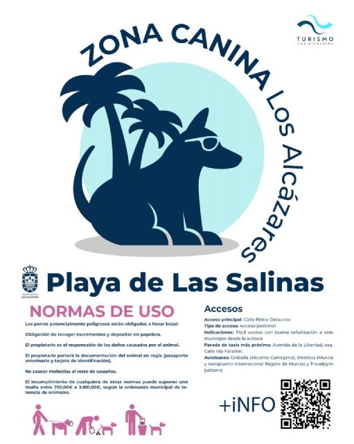 El municipio de Los Alcázares contará este verano con la primera playa canina del Mar Menor. Estará ubicada en la playa de las Salinas y tendrá unos 140 metros de longitud. La zona de la que podrán disfrutar los perros estará delimitada por una valla y estará equipada además con pasarela de acceso, zona de ducha para perros y papeleras.