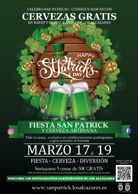 Los Alcázares se une un año más a la cada vez más popular festividad de San Patricio, conocida originalmente como Saint Patrick Day. Así, los días 17, 18 y 19 de marzo los bares, restaurantes y pubs que se hayan adherido a la campaña ofrecerán cervezas negras o artesanales y repartirán entre sus clientes rascas cargados de premios.