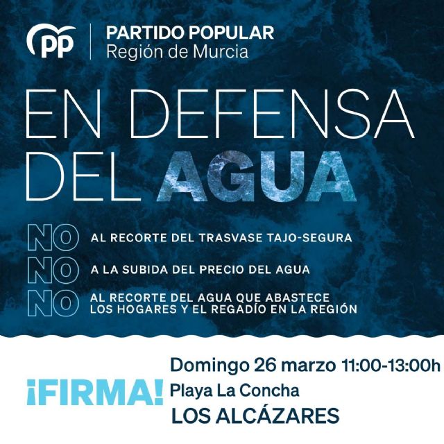 El Partido Popular de Los Alcázares saldrá a la calle con una carpa informativa el próximo 26 de marzo, a partir de las 11:00 horas en la Playa de la Concha, con el fin de "unir a la sociedad en defensa del agua para poner freno a la decisión de Pedro Sánchez de recortar en un 50 por ciento el Trasvase Tajo-Segura".