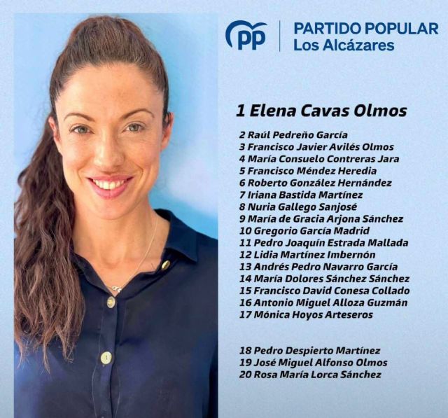 A la cabeza de lista, Elena Cavas, le siguen Raúl Pedreño García, Francisco Javier Avilés Olmos, Maria Consuelo Contreras Jara, Francisco Méndez Heredia, Roberto González Hernández, Iriana Bastida Martínez, Nuria Gallego Sanjosé, Maria de Gracia Arjona Sánchez, Gregorio Sánchez Madrid, Pedro Joaquín Estrada Mallada, Lidia Martínez Imbernon, Andrés Pedro Navarro, Maria Dolores Sánchez Sánchez, Francisco David Conesa Collado, Antonio Miguel Alloza Guzmán, Mónica Hoyos Arteseros, Pedro Despierto Martínez, José Miguel Alfonso Olmos y Rosa Maria Lorca Sánchez.