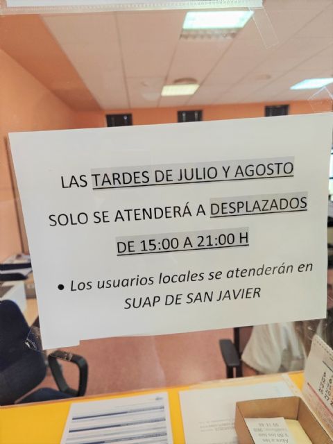 La indignación de los vecinos del municipio ha sido mayúscula al leer en un cartel colgado en la puerta del centro de salud que durante las tardes de julio y agosto, los pacientes desplazados podrán ser atendidos en el centro de salud de Los Alcázares, mientras que los usuarios locales tendrán que desplazarse hasta el SUAP de San Javier para ser atendidos más allá de las 15.00 horas.