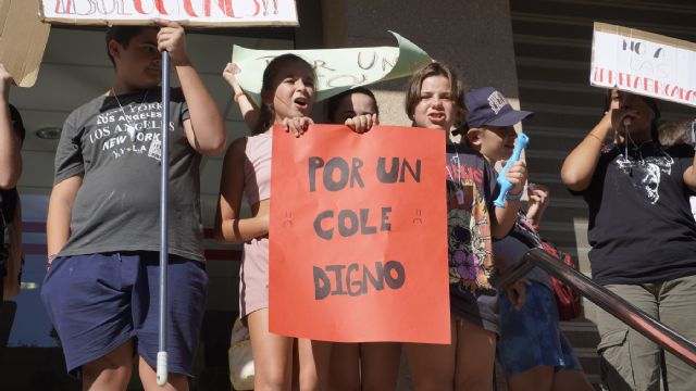 Han sido cerca de 200 las personas que se han trasladado este viernes por la mañana hasta las puertas del edificio ubicado en la Avenida de la Fama de Murcia para protestar por la masificación que sufren los centros educativos y que obliga a dar clases en un total de 15 barracones en todo el municipio de Los Alcázares.