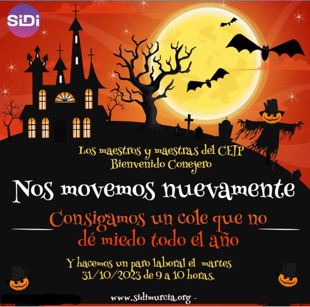 El Sindicato SIDI ha procedido a dar cobertura legal al NUEVO PARO LABORAL, que se suma al realizado el pasado martes 16 de octubre y que ha sido nuevamente demandado por el colectivo de docentes del CEIP Bienvenido conejero de Los Alcázares, apoyados también por las AMPAS del pueblo, que ya hicieron su propia protesta en el colegio y en Murcia en la Consejería de Educación