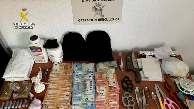En los tres registros efectuados, dos en Los Alcázares y uno en San Pedro del Pinatar, los investigadores de la Benemérita también se han incautado más de 4.000 dosis de cocaína y hachís, dos kilogramos de sustancia de corte, 6.000 euros efectivo, armas blancas y puños americanos, y numerosos objetos empleados para la manipulación y distribución de la droga, como básculas de precisión y envoltorios, entre otros.