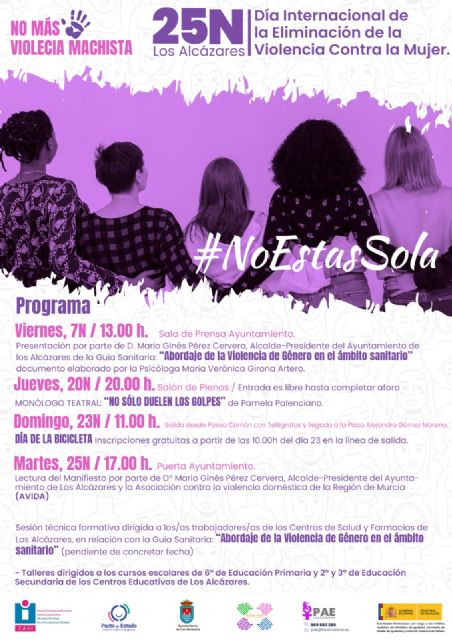 El Ayuntamiento de Los Alcázares, a través de la concejalía de Política Social e Igualdad, ha preparado un completo programa de actividades a lo largo del mes de noviembre para conmemorar el Día Internacional de la Eliminación de la Violencia contra la Mujer.
